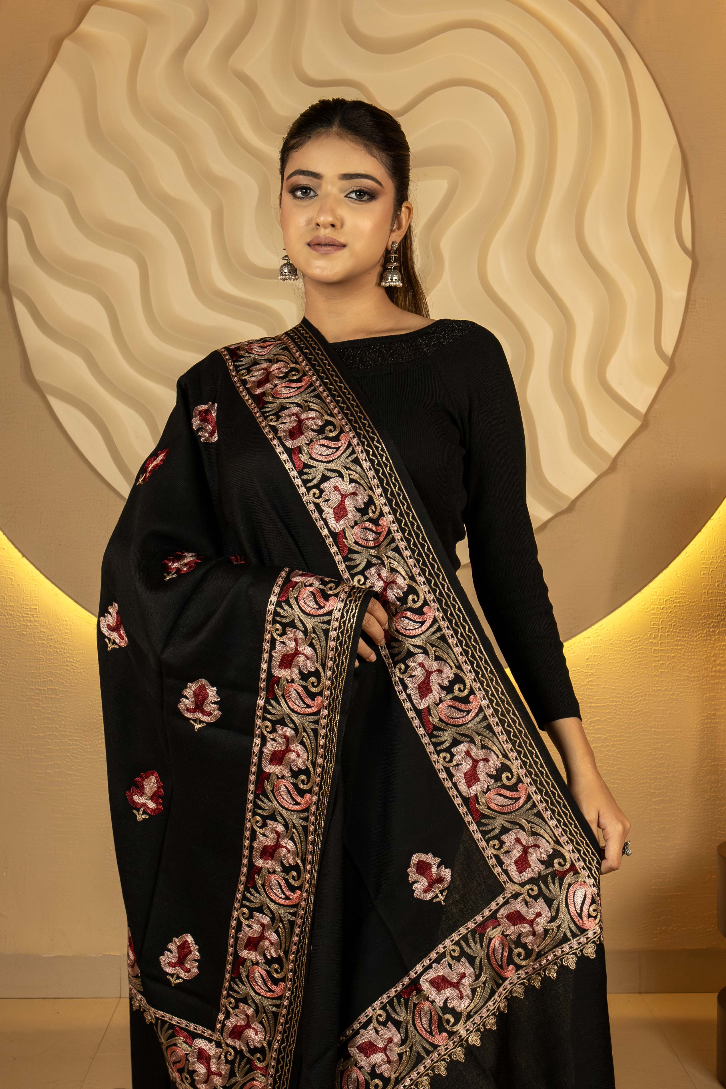 Expertly crafted with aari embroidery, this black pure wool stole for women combines style and comfort. Made of high-quality materials, it offers warmth and a touch of elegance to any outfit. Perfect for any occasion, this stole showcases your sophisticated taste and adds a layer of luxury to your wardrobe.